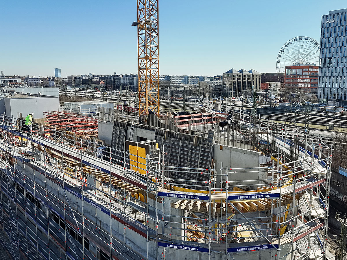 Im Oktober 2023 startete unser Team mit umfangreichen Erdarbeiten in mehr als acht Metern Tiefe und meisterte dabei viele Herausforderungen. Unter anderem verläuft quer durch das Bauvorhaben ein Bestandskanal. Dieser wird in das Gebäude integriert. Außerdem sind viele Wände in der anspruchsvollen Sichtbetonklasse 3 auszuführen.