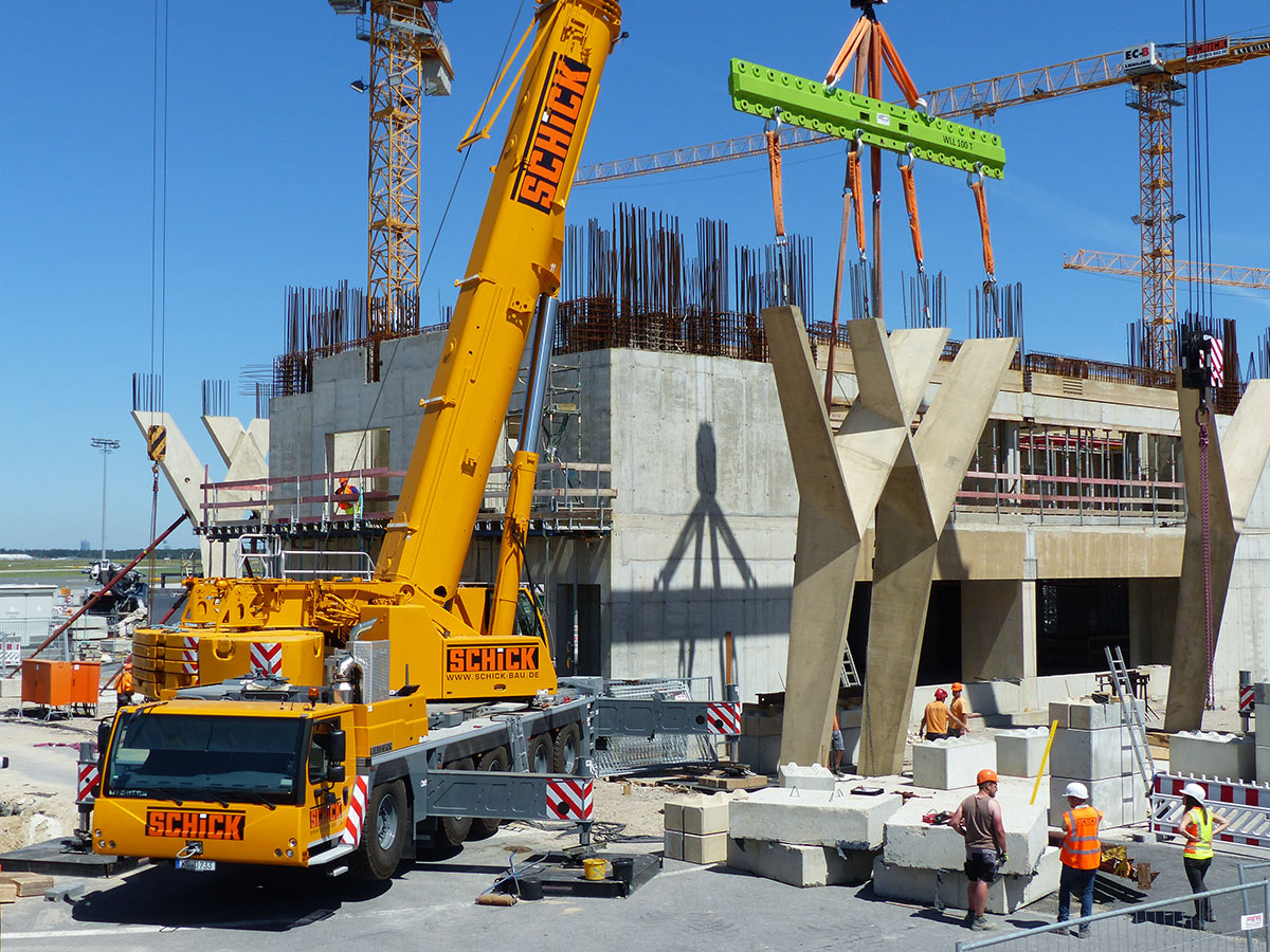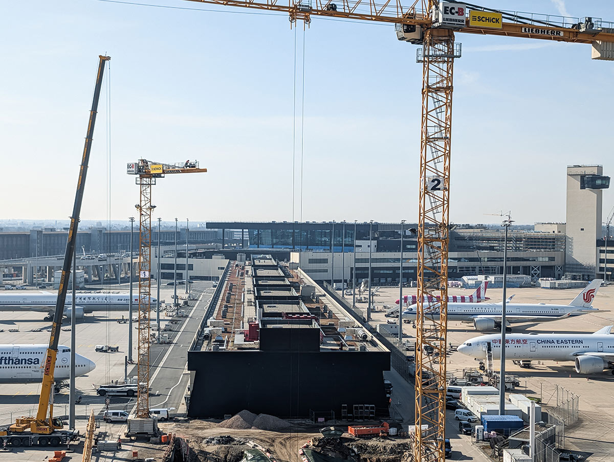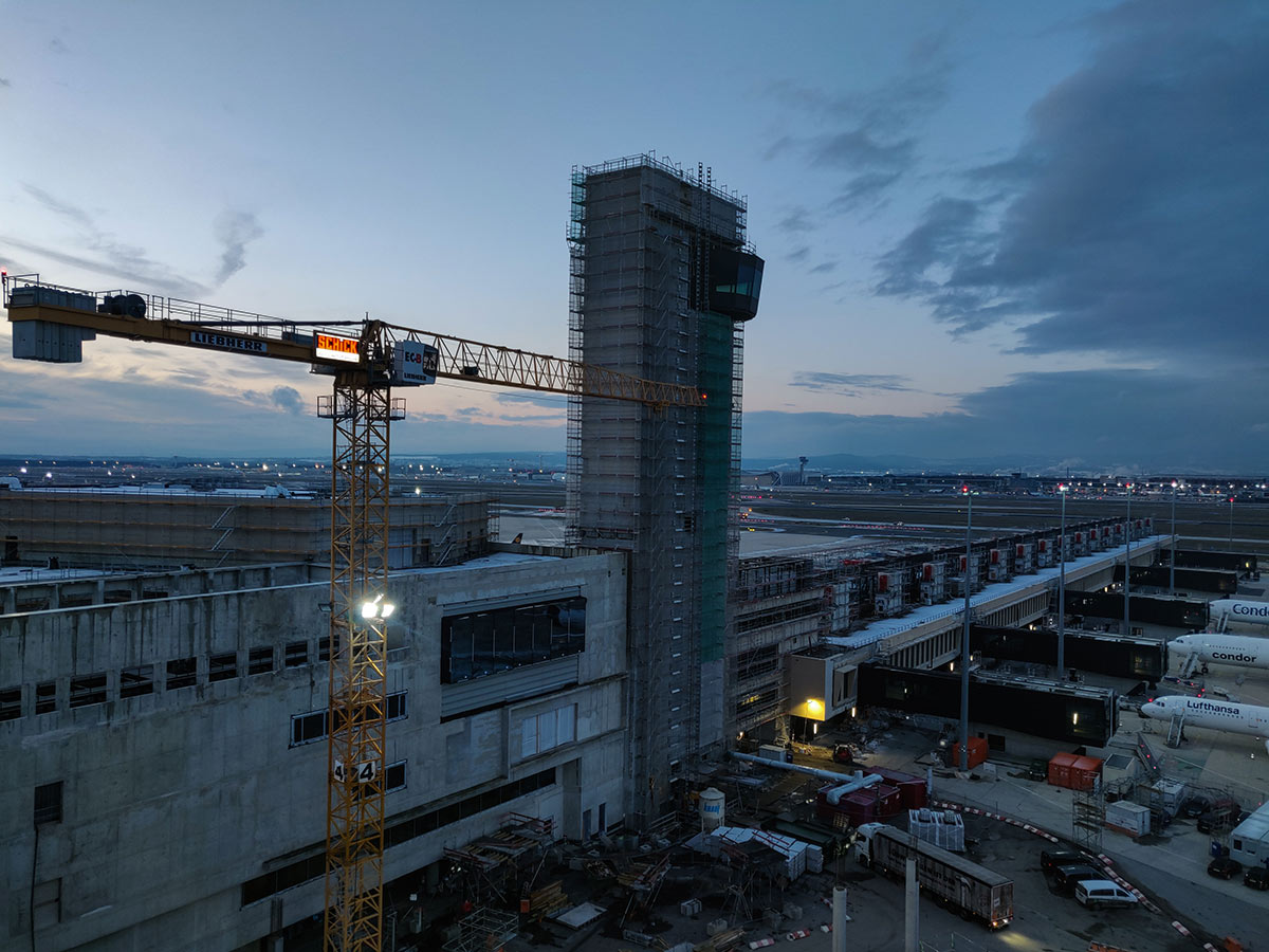 Die Anton Schick GmbH verantwortete den erweiterten Rohbau der Flugsteige H und J inklusive des rund 69 Meter hohen Vorfeldkontrollturms sowie die Bauabschnitte 2.1 und 2.2 am Pier G. In Spitzenzeiten waren bis zu 350 Mitarbeitende und 15 Turmdrehkräne gleichzeitig im Einsatz. Sie prägten das Baufeld und sorgten dafür, dass mehrere Bauabschnitte zeitgleich realisiert werden konnten. Parallele Prozesse wurden dabei nicht nur koordiniert – sie wurden präzise aufeinander abgestimmt.