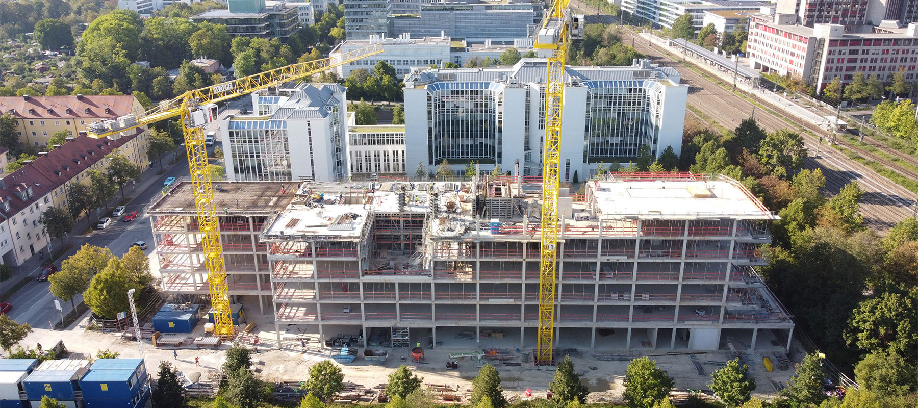 Der Baukörper besteht aus zwei Untergeschossen und sechs oberirdischen Vollgeschossen, die mit insgesamt drei Treppenhäusern miteinander verbunden sind. Wir halten beim Bau die vorgegebenen LEED-Gold-Standards ein und setzen so in enger Zusammenarbeit mit dem Auftraggeber neue Maßstäbe für einen zukunftsorientierten und ökologischen Arbeitsplatz am stetig wachsenden Standort in München. Eine besondere Herausforderung während der Bauphase ist die Logistik, da das gesamte Baufeld fast vollständig bebaut wird. Die Andienung kann also nur über die viel befahrene Hansastraße erfolgen.