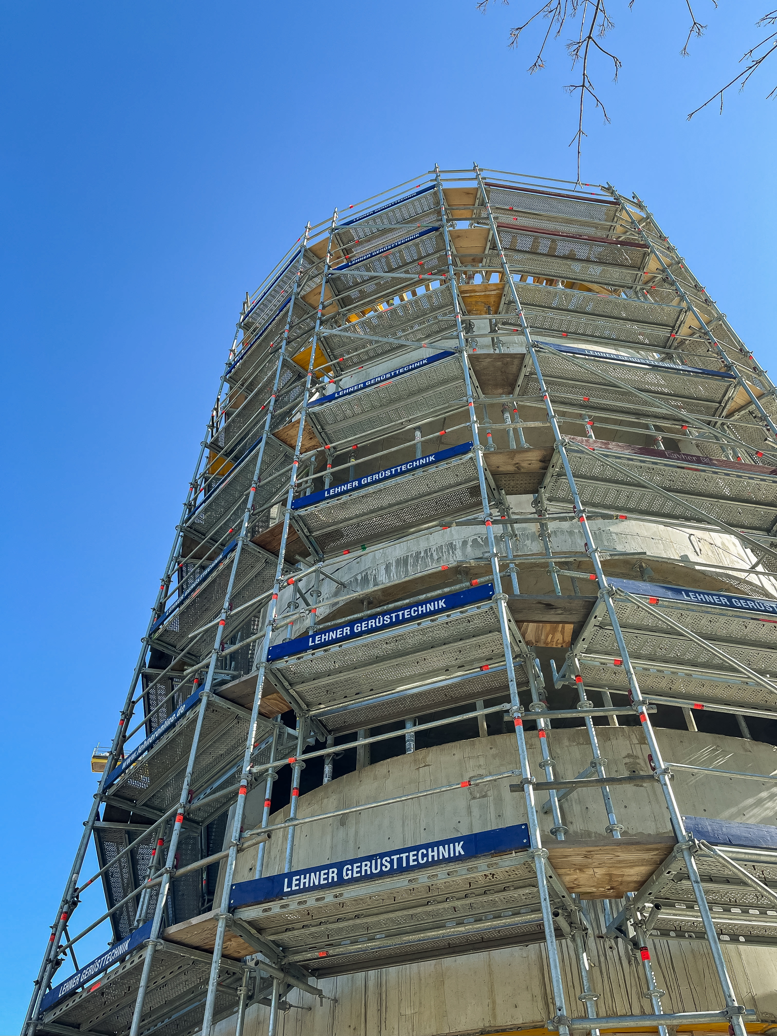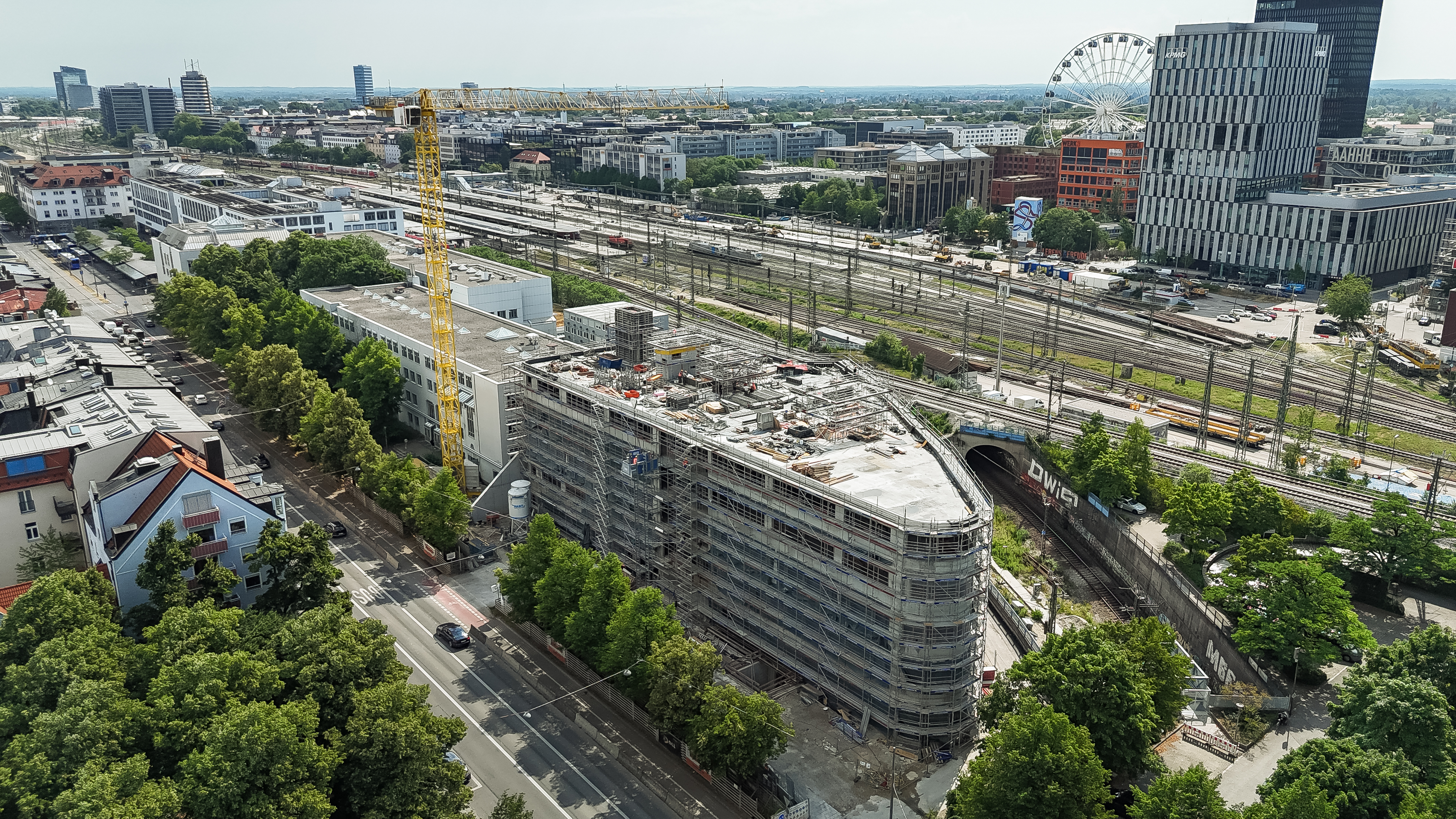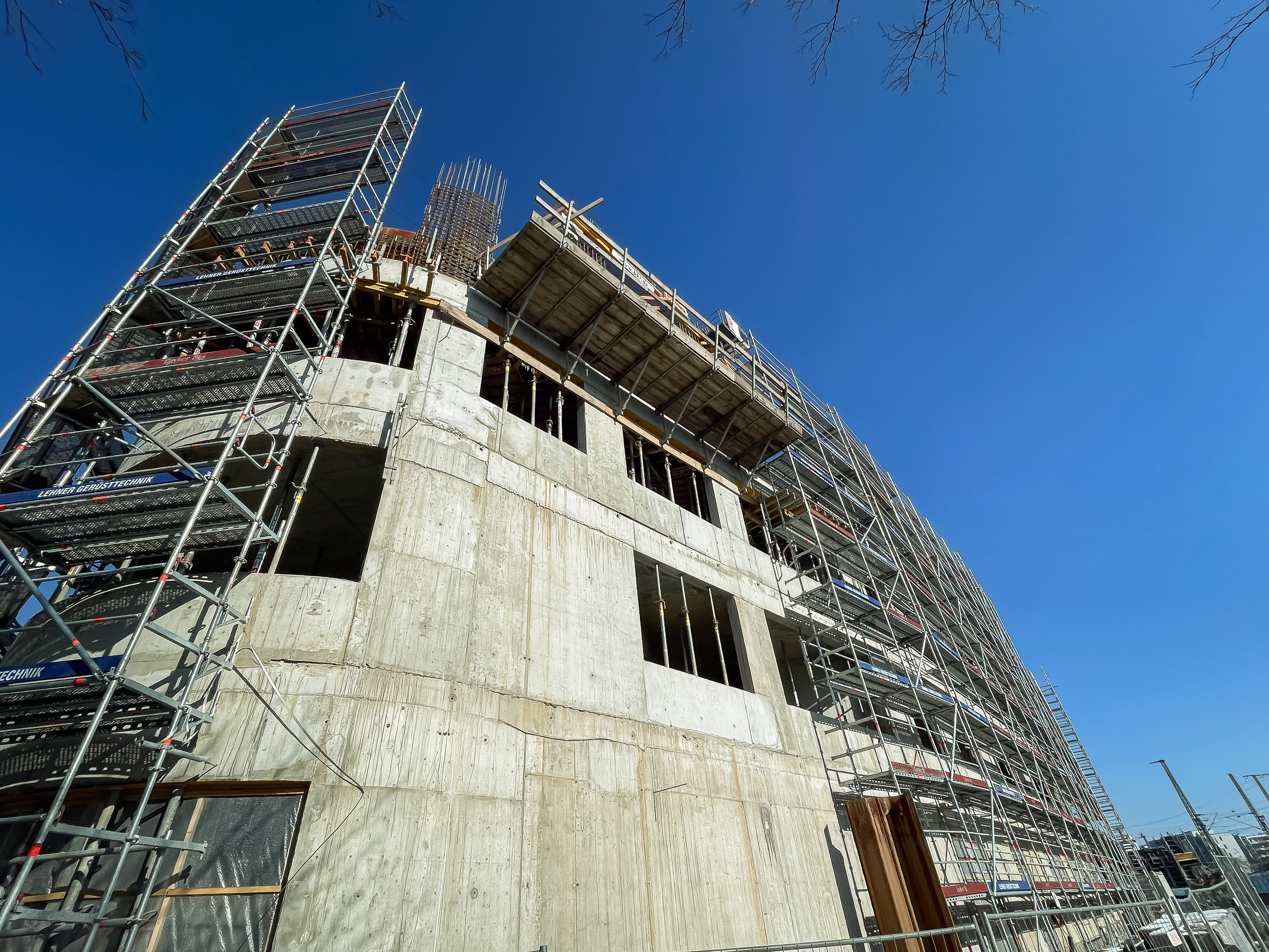 Unser Team verantwortete die gesamten Rohbauarbeiten. Zu den Leistungen gehörten außerdem die Bewehrungsverlegung, die Betonage sowie die Koordination der beteiligten Gewerke. Besonders hervorzuheben ist die enge Zusammenarbeit mit unserem Fertigteilwerk in Bad Kissingen: Hier wurden 36 Sichtbetontreppen der Klasse SB3 gefertigt und nach München geliefert. Einige dieser Treppenläufe wogen bis zu 8,8 Tonnen. Ein eingelegter Natursteinstreifen verleiht den Treppen nicht nur eine hochwertige Optik, sondern dient auch als Kontraststreifen für Menschen mit eingeschränkter Sehkraft.