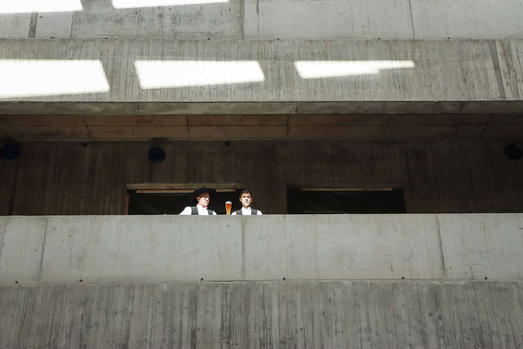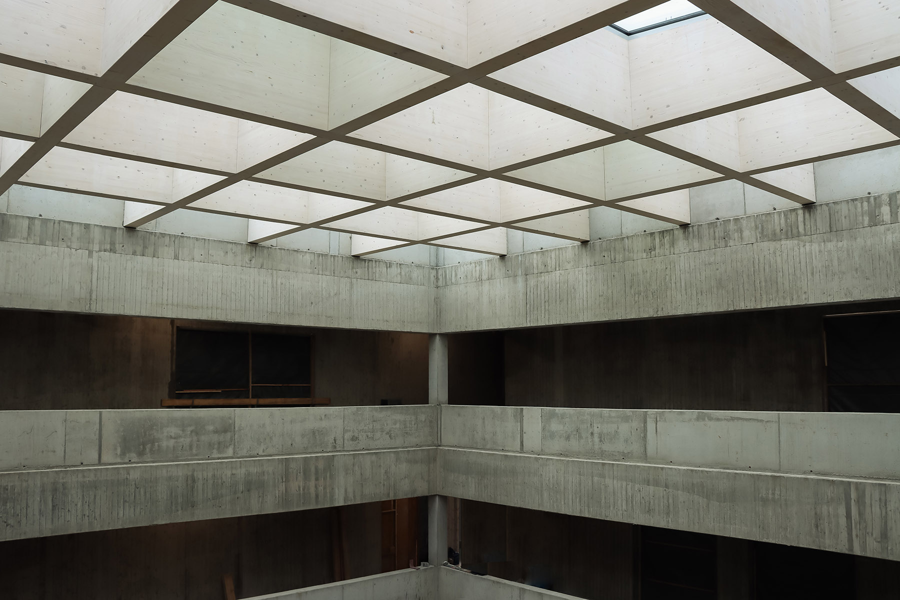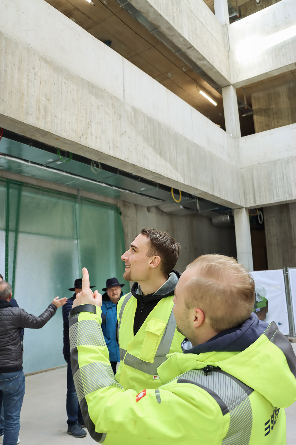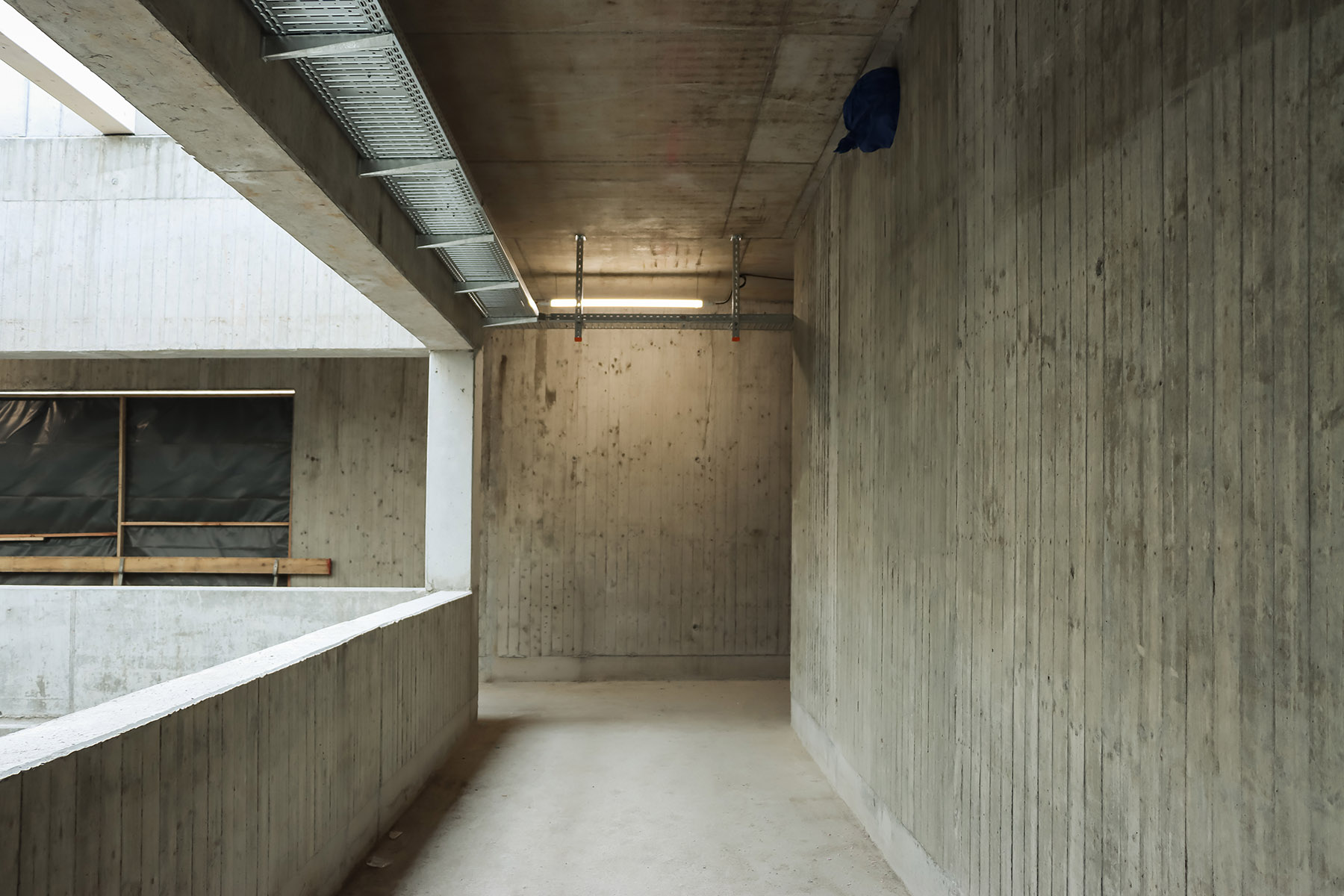 Ein prägendes architektonisches Element sind die großflächigen Sichtbetonwände in Bretterstruktur. Insgesamt wurden rund 5.000 m² Sichtbetonflächen in Holzoptik in Ortbeton hergestellt, die dem Schulgebäude eine klare, moderne und zugleich warme Anmutung verleihen. Ergänzt wird der Rohbau durch neun Fertigteiltreppen und zwei Fertigteilsitzstufen.