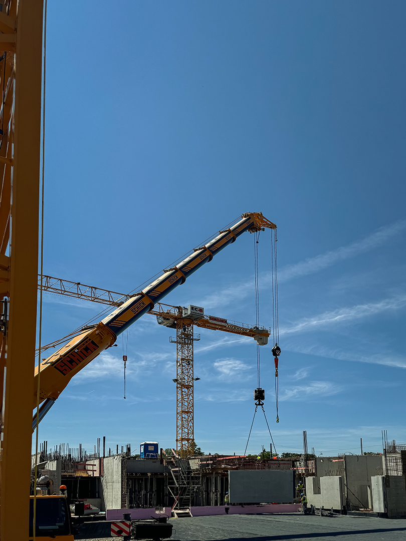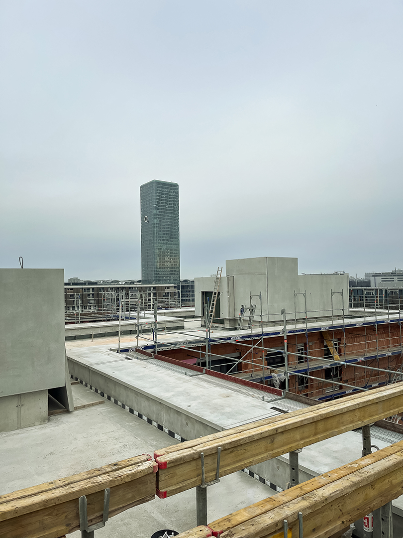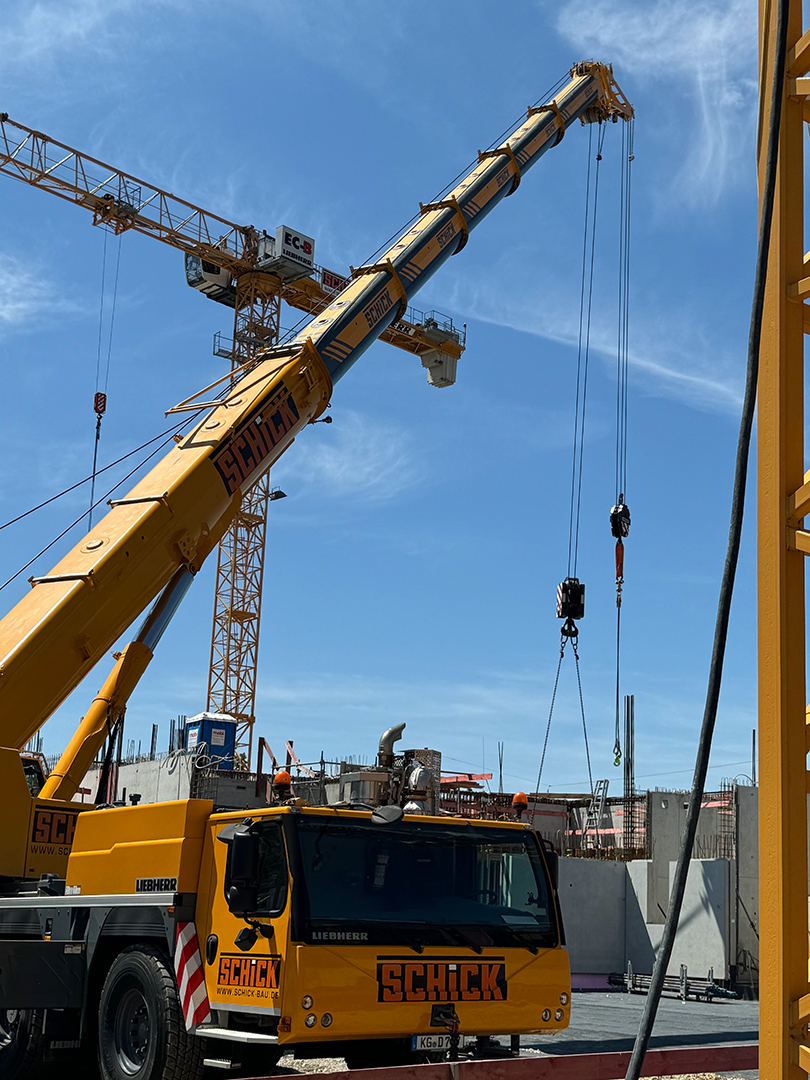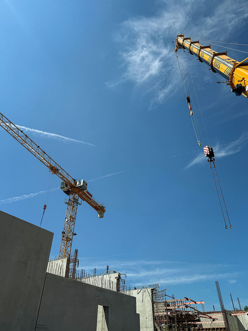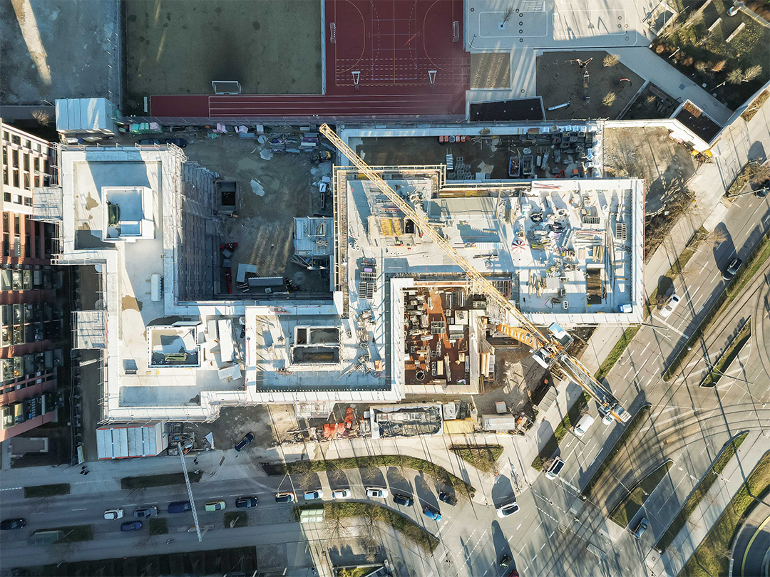 Die Anton Schick GmbH übernahm bei diesem Projekt die vollständige Ausführung des Rohbaus – von den Erd- und Abdichtungsarbeiten über den Beton- und Stahlbetonbau bis hin zum Mauerwerksbau. Ein besonderes Augenmerk lag auf der präzisen Montage von über 815 Stahlbetonfertigteilen, darunter Sandwichwände, Loggia-Platten, vorgehängte Fassadenelemente, Treppenläufe und Vordächer. Eine technische Herausforderung stellte die Verarbeitung der dreischichtigen Fertigteilsandwichwände im Erdgeschoss dar: Die mit integrierter Kerndämmung versehenen Elemente mussten während der Montage zweimal um 180° gedreht werden, um sie passgenau zu positionieren – eine Aufgabe, die exakte Planung, Erfahrung und millimetergenaue Ausführung erforderte.