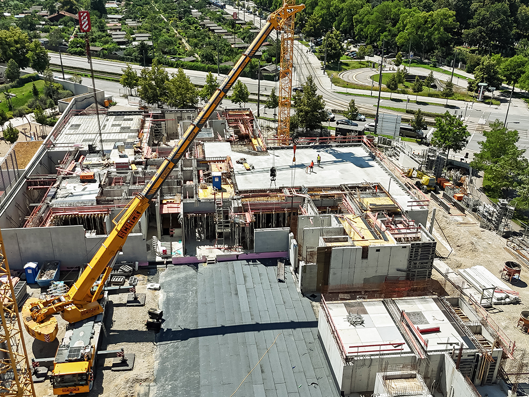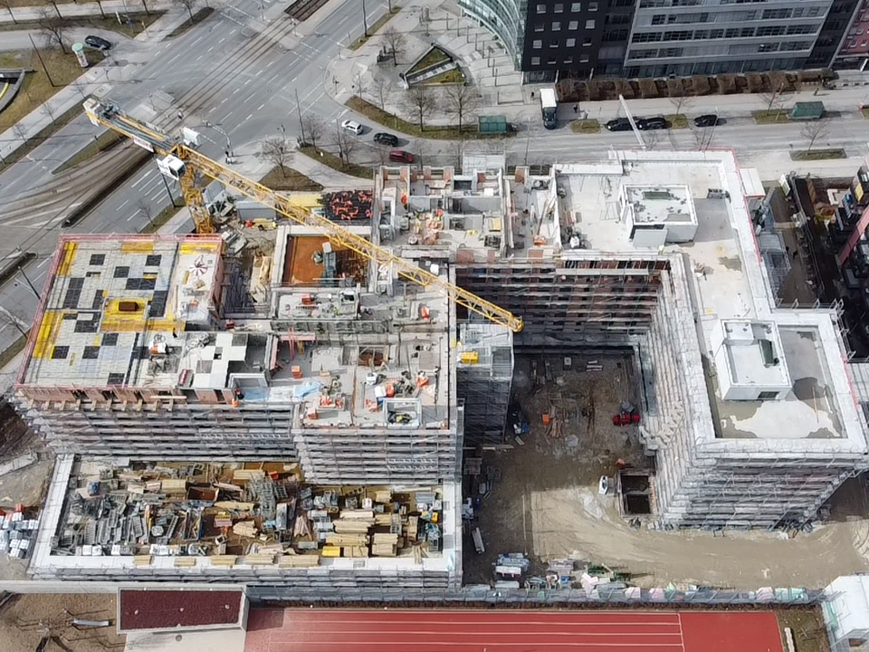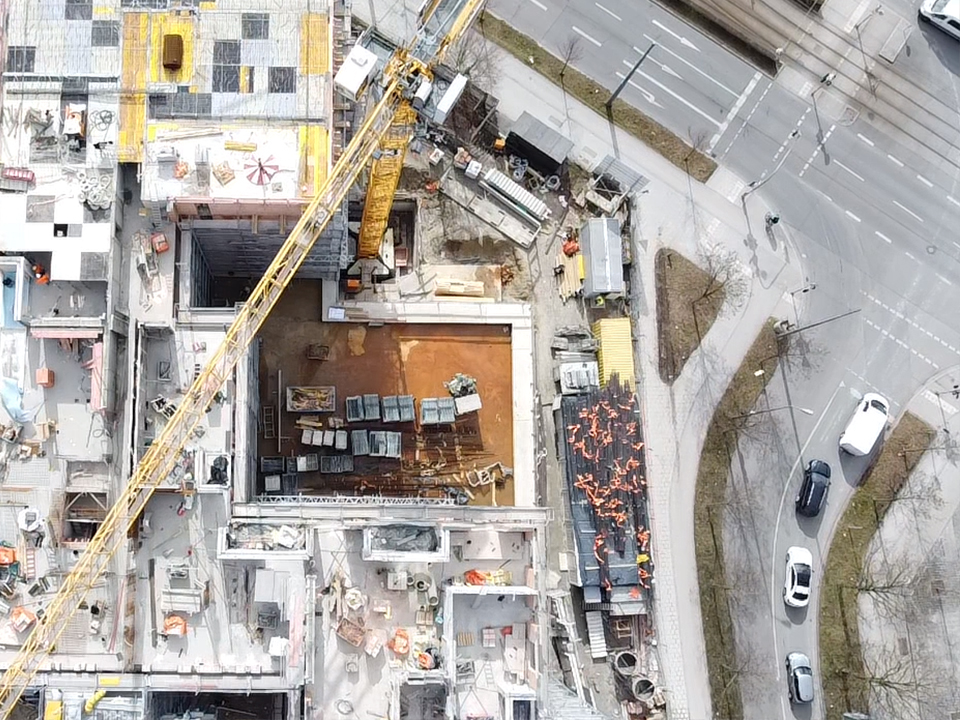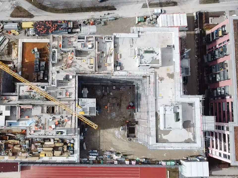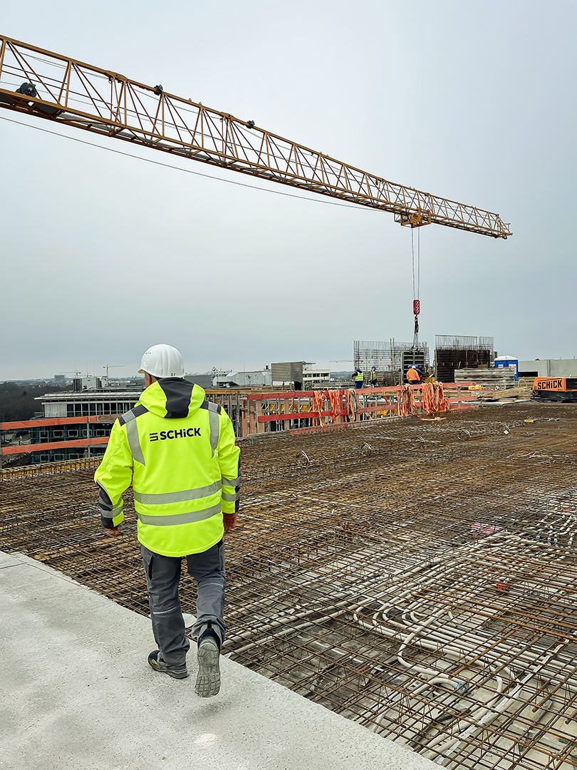 Die Anton Schick GmbH übernahm bei diesem Projekt die vollständige Ausführung des Rohbaus – von den Erd- und Abdichtungsarbeiten über den Beton- und Stahlbetonbau bis hin zum Mauerwerksbau. Ein besonderes Augenmerk lag auf der präzisen Montage von über 815 Stahlbetonfertigteilen, darunter Sandwichwände, Loggia-Platten, vorgehängte Fassadenelemente, Treppenläufe und Vordächer. Eine technische Herausforderung stellte die Verarbeitung der dreischichtigen Fertigteilsandwichwände im Erdgeschoss dar: Die mit integrierter Kerndämmung versehenen Elemente mussten während der Montage zweimal um 180° gedreht werden, um sie passgenau zu positionieren – eine Aufgabe, die exakte Planung, Erfahrung und millimetergenaue Ausführung erforderte.