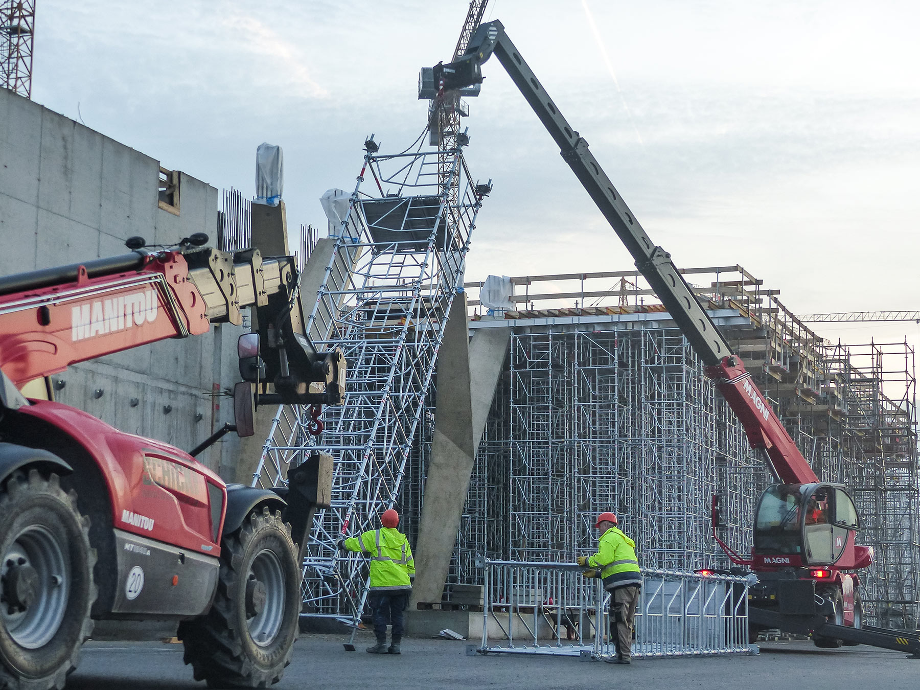Vor Ort wurden die Stützen mit zwei Autokranen millimetergenau montiert und auf sieben Grad Neigung ausgerichtet. Bis alle 86 Y-Stützen am Flugsteig J errichtet waren, verging Zeit. Erst danach konnte die auskragende Decke der Ebene 2 aufgesetzt werden – ein entscheidender Schritt für die Gestalt des längsten Flugsteigs von Terminal 3.