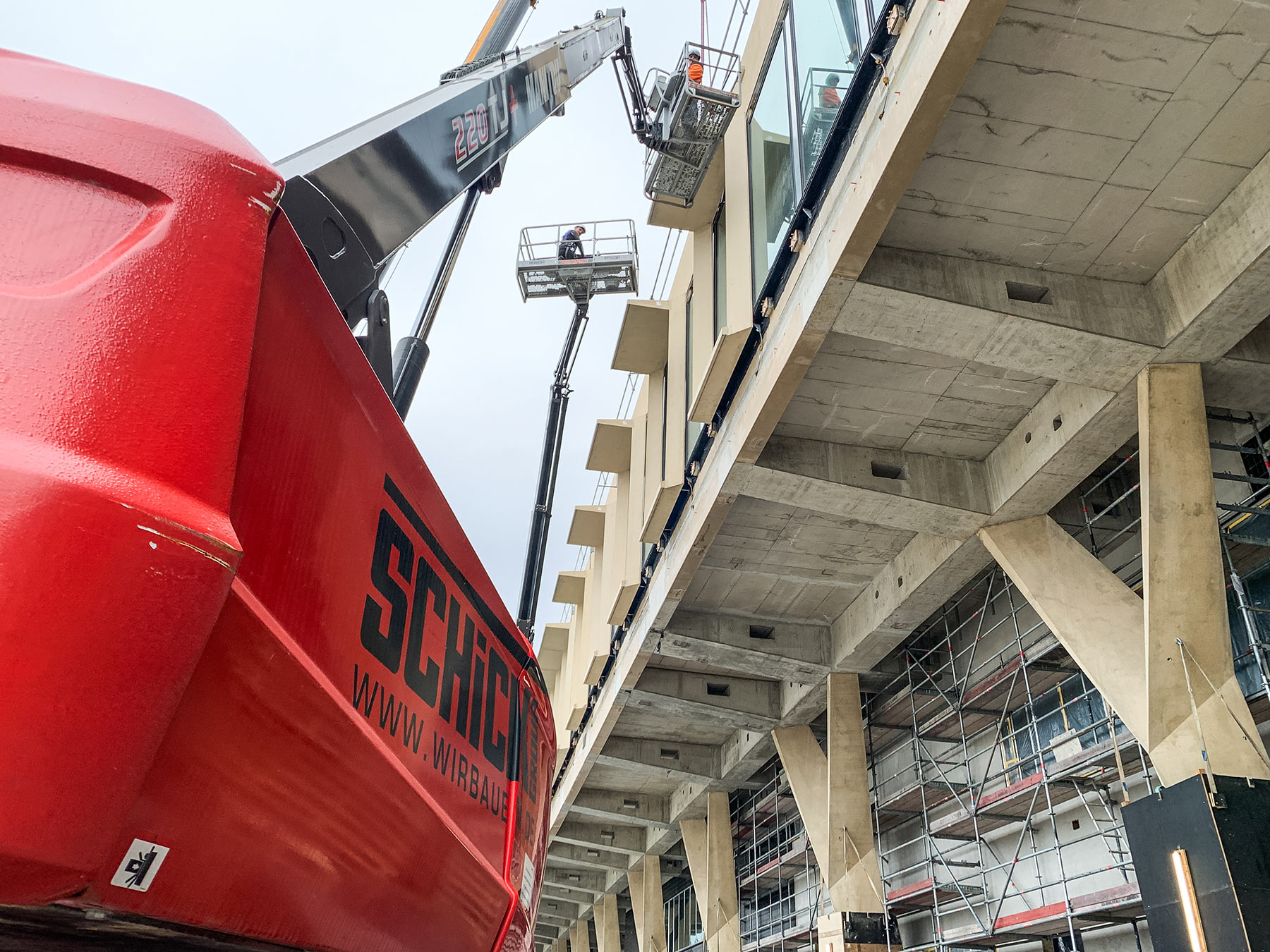 Der Bau startete im Kellergeschoss mit aufwendigen Schal- und Bewehrungsarbeiten zur statischen Verstärkung der Decken. Anschließend wuchsen die Ebenen nach oben – teils in Ortbeton, teils mit vorgefertigten Betonelementen. Dieses hybride Bausystem kombinierte die Vorteile beider Verfahren und ermöglichte eine schnelle, effiziente und zugleich ästhetisch anspruchsvolle Realisierung.